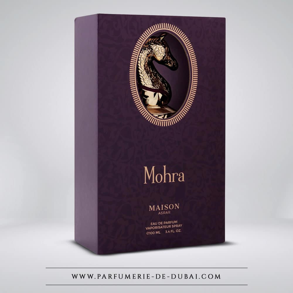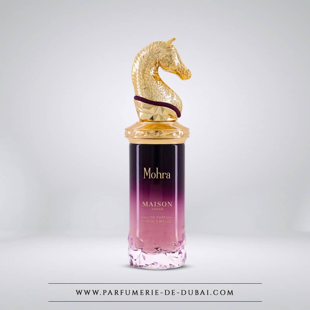 Esculpida como una joya real, la botella de Mohra lleva la firma de Casa Asrar Un caballo dorado que simboliza la libertad y la fuerza. Su gradación púrpura evoca las dunas al atardecer: la promesa de una fragancia única, audaz y noble.