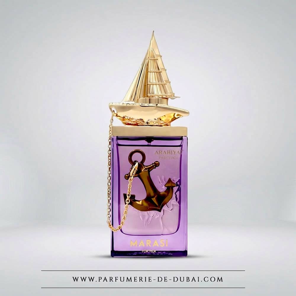 Marasi es un término árabe que hace referencia a las velas blancas de los elegantes barcos que surcan los mares, símbolo de refinada feminidad y libertad marítima. Se trata de una referencia directa al’elegancia-marino-femenino y navegación sofisticada que evoca la fragancia. El nombre celebra la dulzura afrutada-floral-gourmand, la elegancia floral de la naranja-naranja-barbacoa-papa-violeta y la calidez de la tonka-vainilla-caramelo-almizcle, como una cautivadora y preciosa firma marina-femenina-luxe. El frasco violeta con el ancla esculpida en oro en 3D y el tapón dorado en miniatura del velero representan esta estética marítima elegante y la cautivadora feminidad marina pura y refinada.