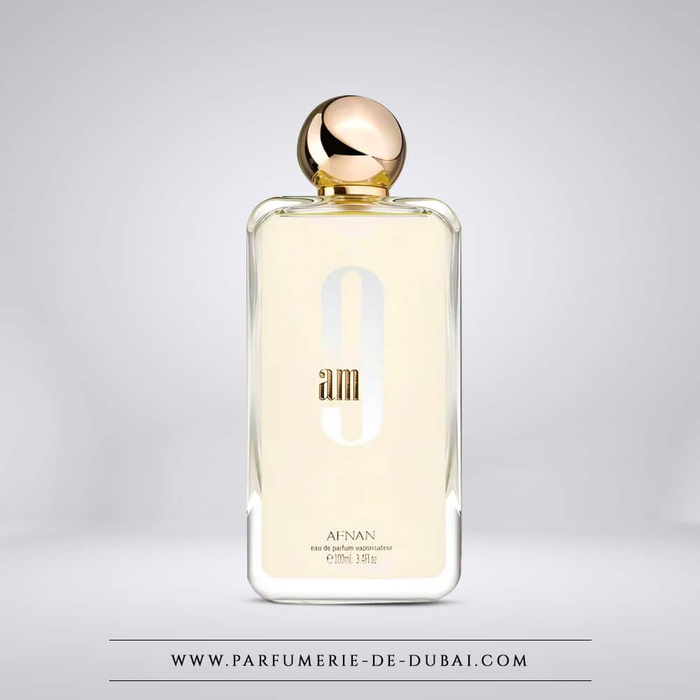 El frasco de 9am tiene forma rectangular con contornos suavizados, rematado con un tapón esférico dorado que le confiere un aspecto elegante y reconocible al instante. La impresión general es de feminidad limpia, moderna y pulida.