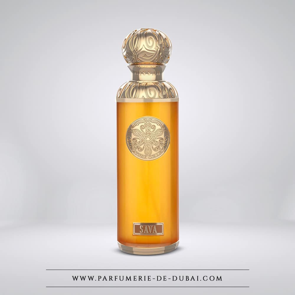 SAVA se presenta en un frasco. ámbar dorado, realzado por los emblemáticos motivos orientales de Gissah. Una estética cálida, elegante y atemporal, en perfecta armonía con su universo olfativo goloso y amaderado.