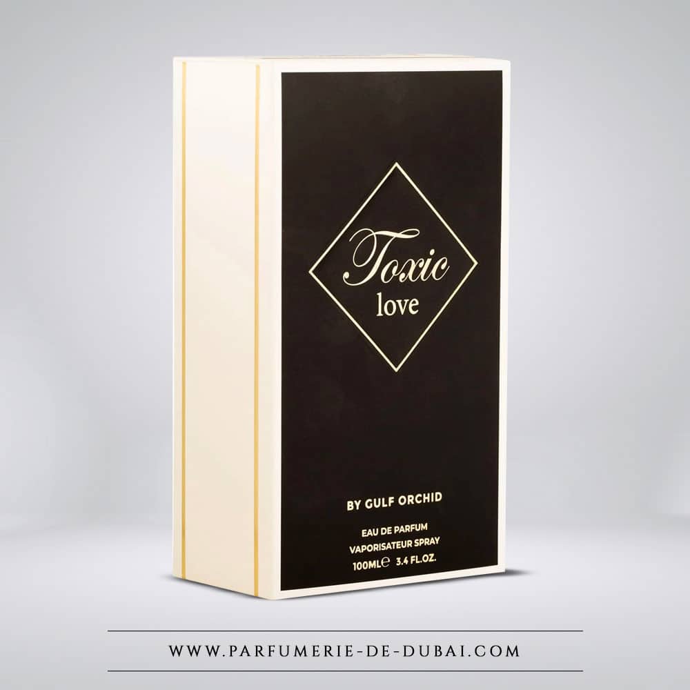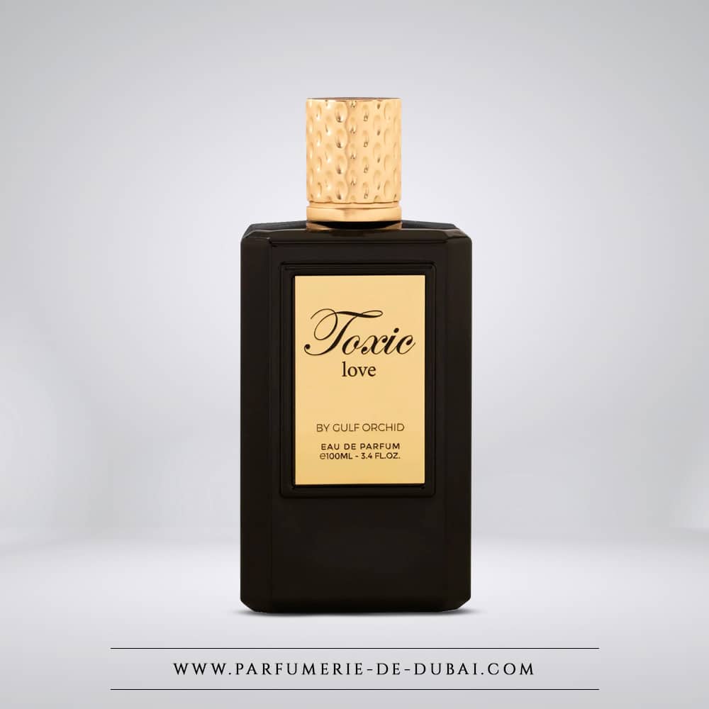 Toxic Love si presenta in un flacone nero opaco dalle linee rette con un'elegante placca dorata che evoca lusso e seduzione. Il tappo, anch'esso dorato e strutturato, rafforza l'aspetto premium del flacone.
