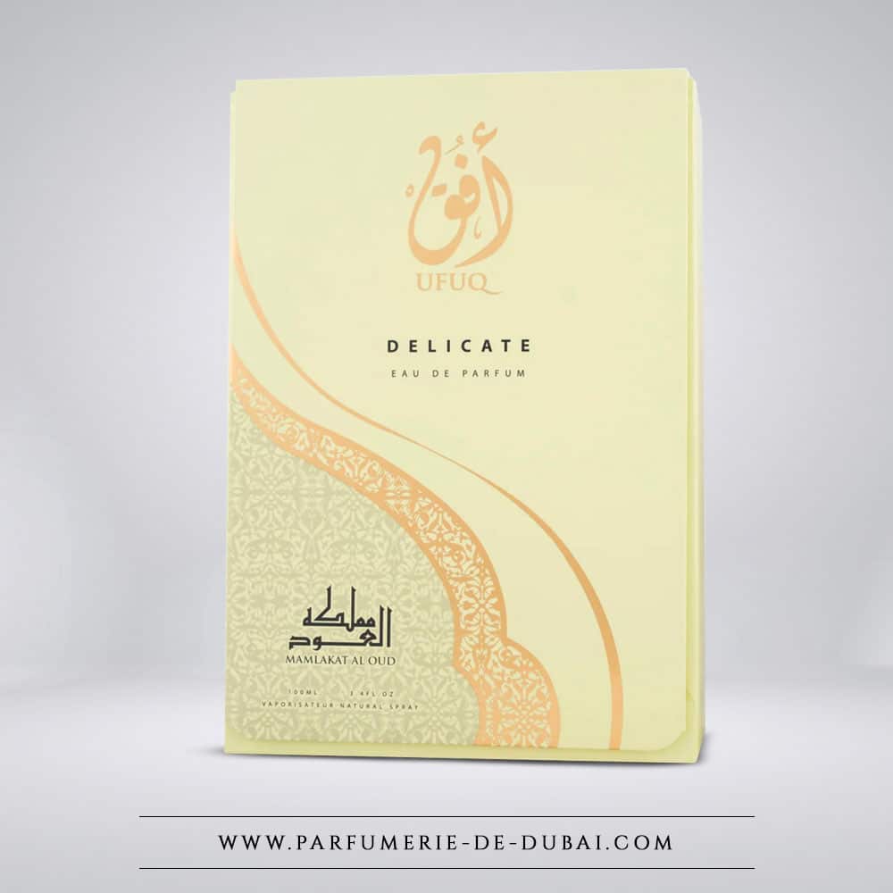 "Ufuq Delicate" buteliukas yra liekno silueto, nuspalvintas gaivia, raminančia pasteline žalia spalva. Karališko stiliaus auksinė galvutė suteikia buteliukui prabangos, būdingos karališkam stiliui. Mamlakat Al Oud.