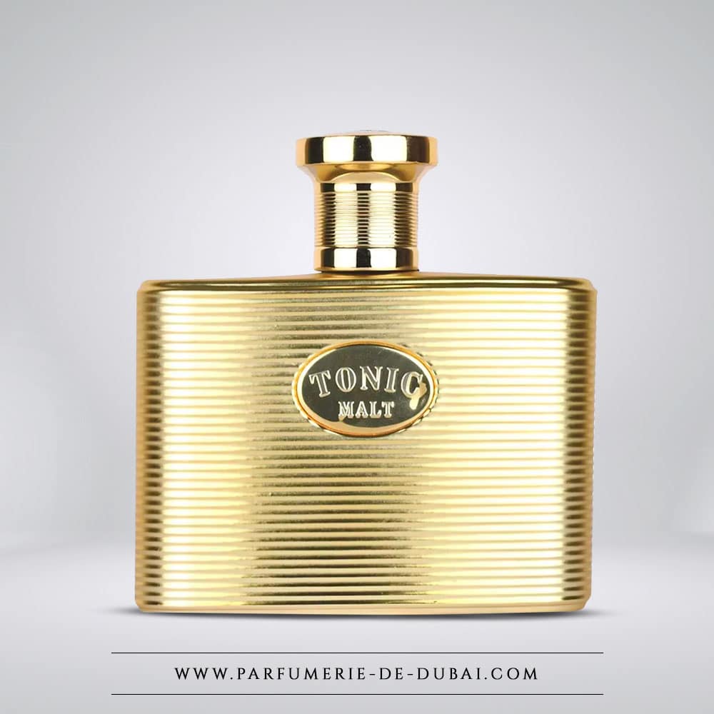 De fles van Tonic Malt heeft een esthetische vormgeving. volledig goudkleurig, met een geborsteld metaal dat doet denken aan hoogwaardige flacons. De horizontale lijnen creëren een modern en tactiel visueel effect, terwijl de gouden cilindrische dop de premium en mannelijke uitstraling versterkt. Een stralende, luxueuze en krachtige presentatie, in lijn met de rijke geur van het parfum.