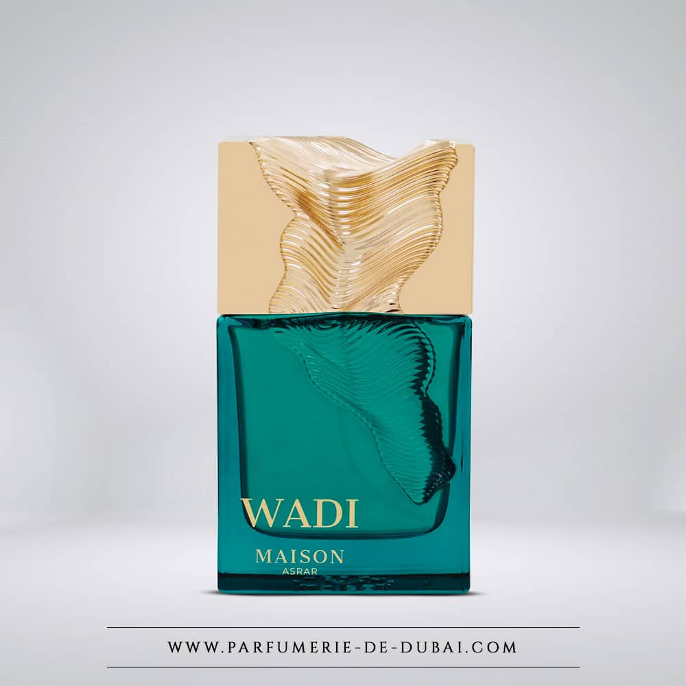 De turquoise fles van Wadi doet denken aan oases van helder water in het hart van de woestijn, met daarbovenop een gouden muts gebeeldhouwd als een zandreliëf. Een olfactorisch en visueel kunstwerk, een weerspiegeling van onze expertise. Huis Asrar luxe, balans en diepte.