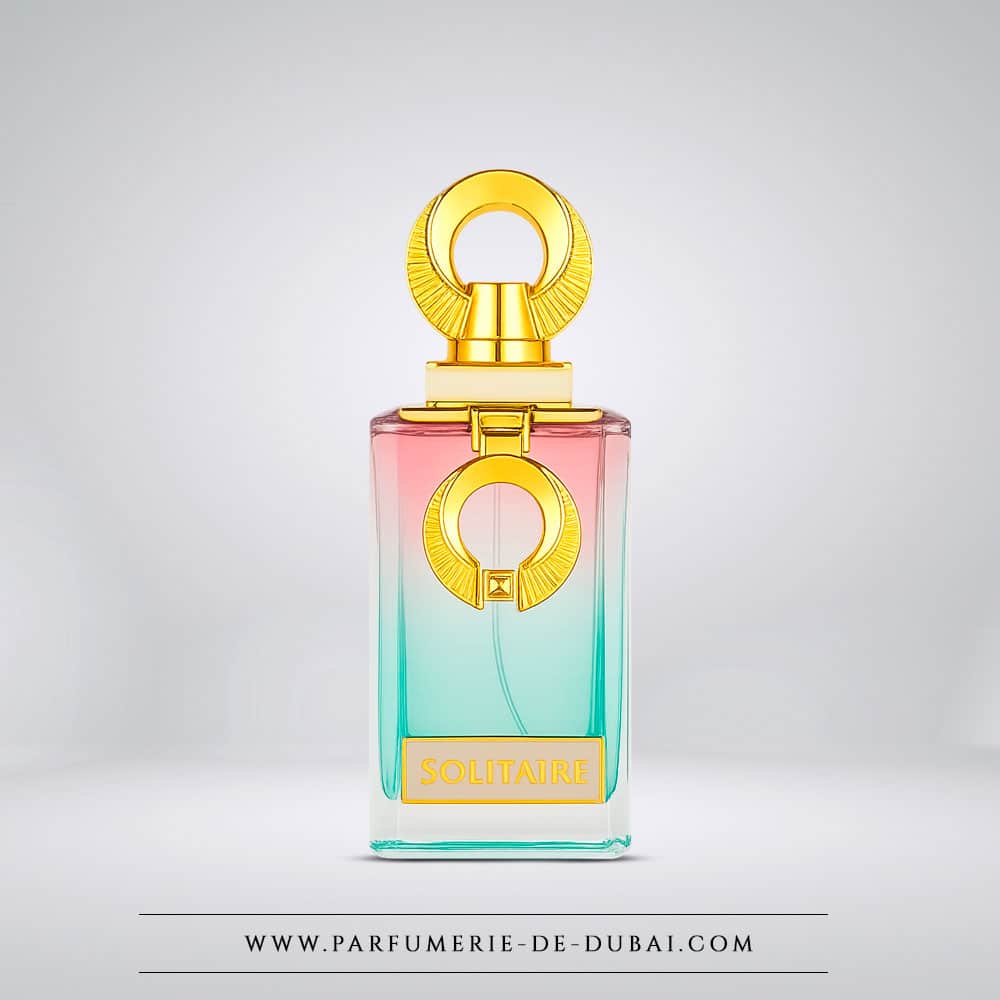 Solitaire vem num frasco com degradê rosa pálido a verde menta, adornado com uma tampa dourada escultural. Uma estética elegante, suave e luminosa, perfeitamente alinhada com o espírito calmo e sofisticado da fragrância.