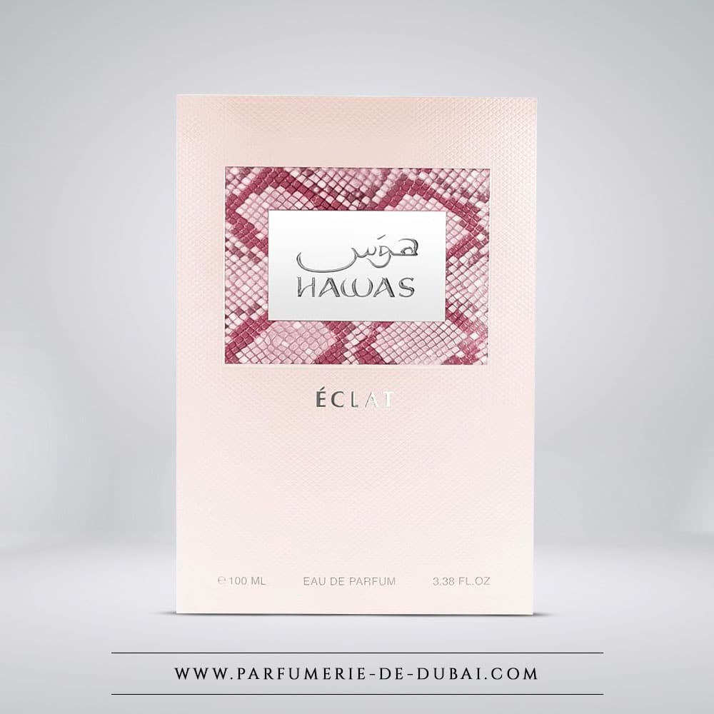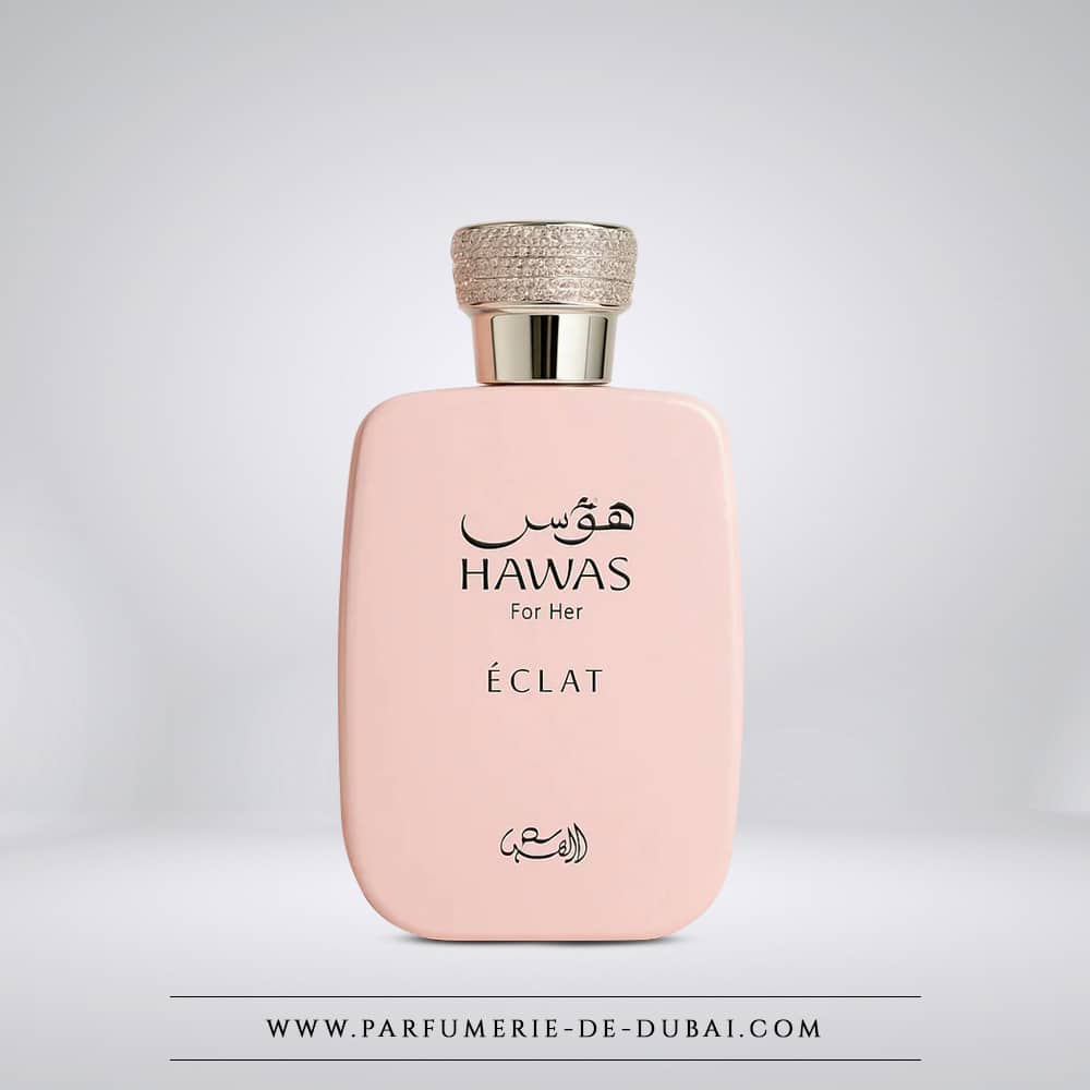 Hawas For Her Éclat vem num frasco rosa pálido, suave e minimalista, fiel aos códigos elegantes da casa Rasasi. Uma estética feminina, moderna e intemporal.