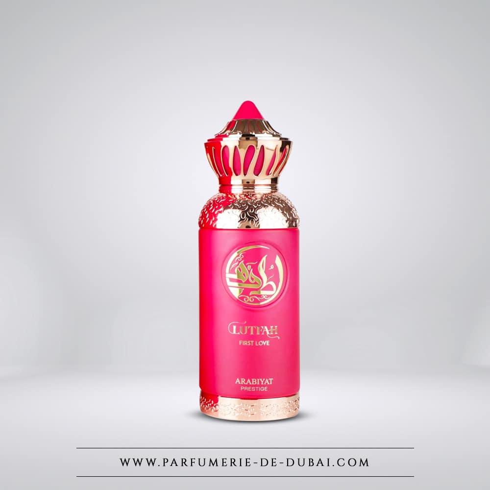 Apresentado num frasco rosa vivo com detalhes dourados, Lutfah First Love seduz pela sua estética refinada e glamorosa. Os motivos cinzelados e a tampa esculpida evocam os códigos da perfumaria oriental de alta qualidade, enquanto a cor intensa reforça a sua identidade feminina, doce e encantadora.