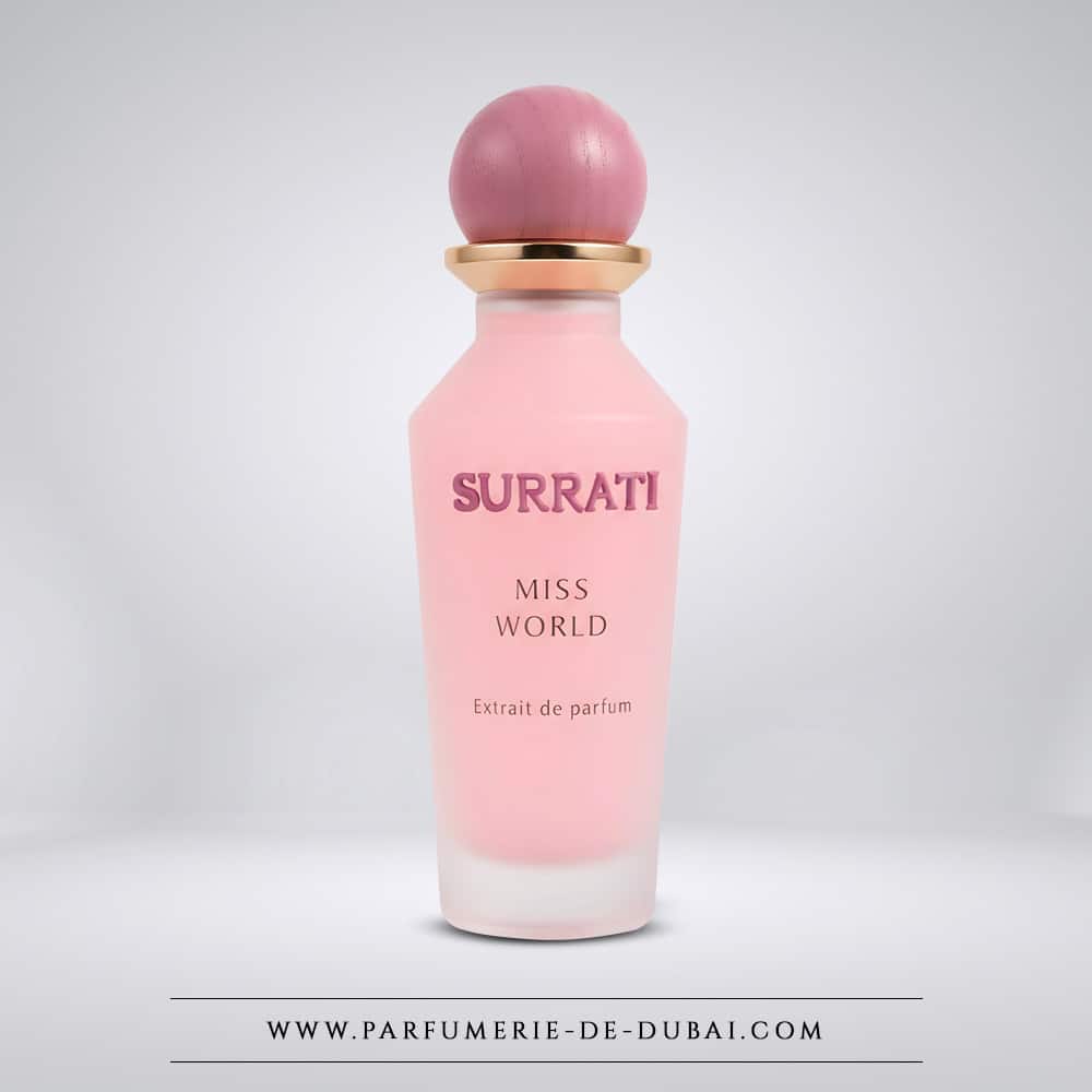 Miss World é apresentado num frasco rosa mate com uma tampa texturada, uma estética suave, moderno e sofisticado fiel à casa Surrati.
