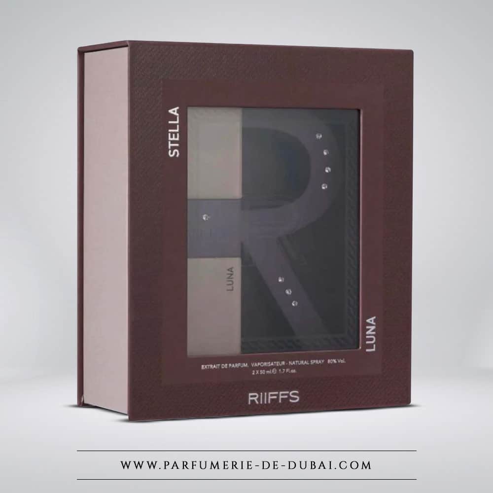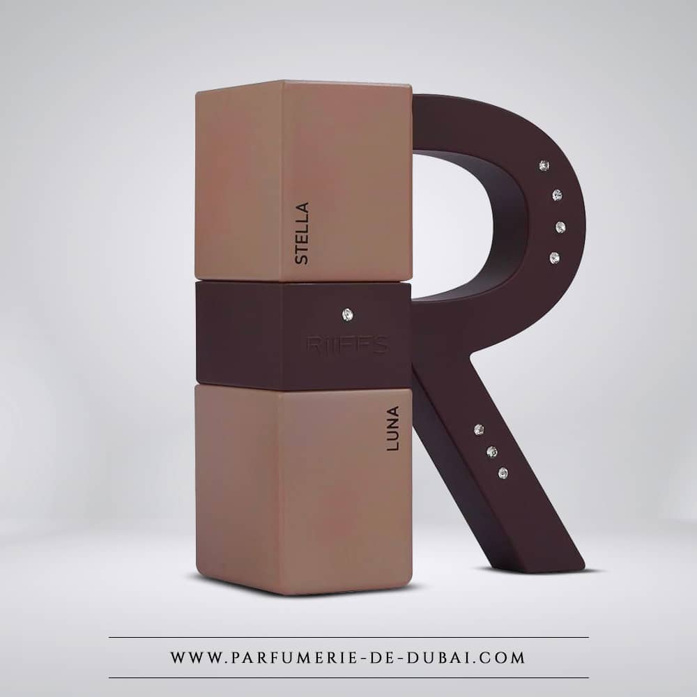 R Luna & R Stella Os perfumes Riiffs compõem um conjunto feminino único: dois extratos de perfume de 50 ml cada, reunidos numa embalagem escultural em forma de “R”. Uma criação moderna, elegante e pensada para oferecer duas assinaturas olfativas complementares: uma leitosa e floral, a outra gourmand e oriental.